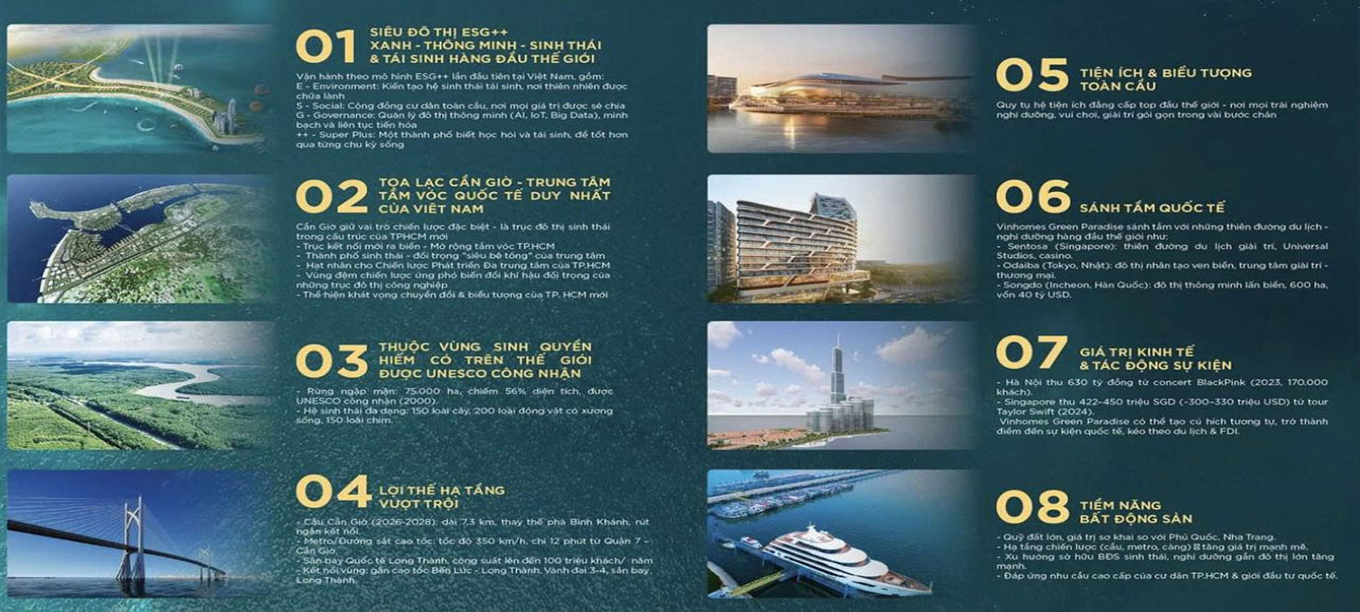 🌟Cảng quốc tế Cần Giờ: Cảng trung chuyển quốc tế với công suất dự kiến 100 triệu tấn hàng hóa mỗi năm sẽ trở thành một trong ba cảng lớn nhất Việt Nam, tạo ra khoảng 200.000–300.000 việc làm chất lượng cao. Nhu cầu nhà ở gia tăng mạnh mẽ kéo theo giá trị bất động sản tại Vinhomes Green Paradise được kỳ vọng tăng 200–300% trong vòng 5–7 năm, mang lại lợi ích trực tiếp cho cư dân hiện hữu.