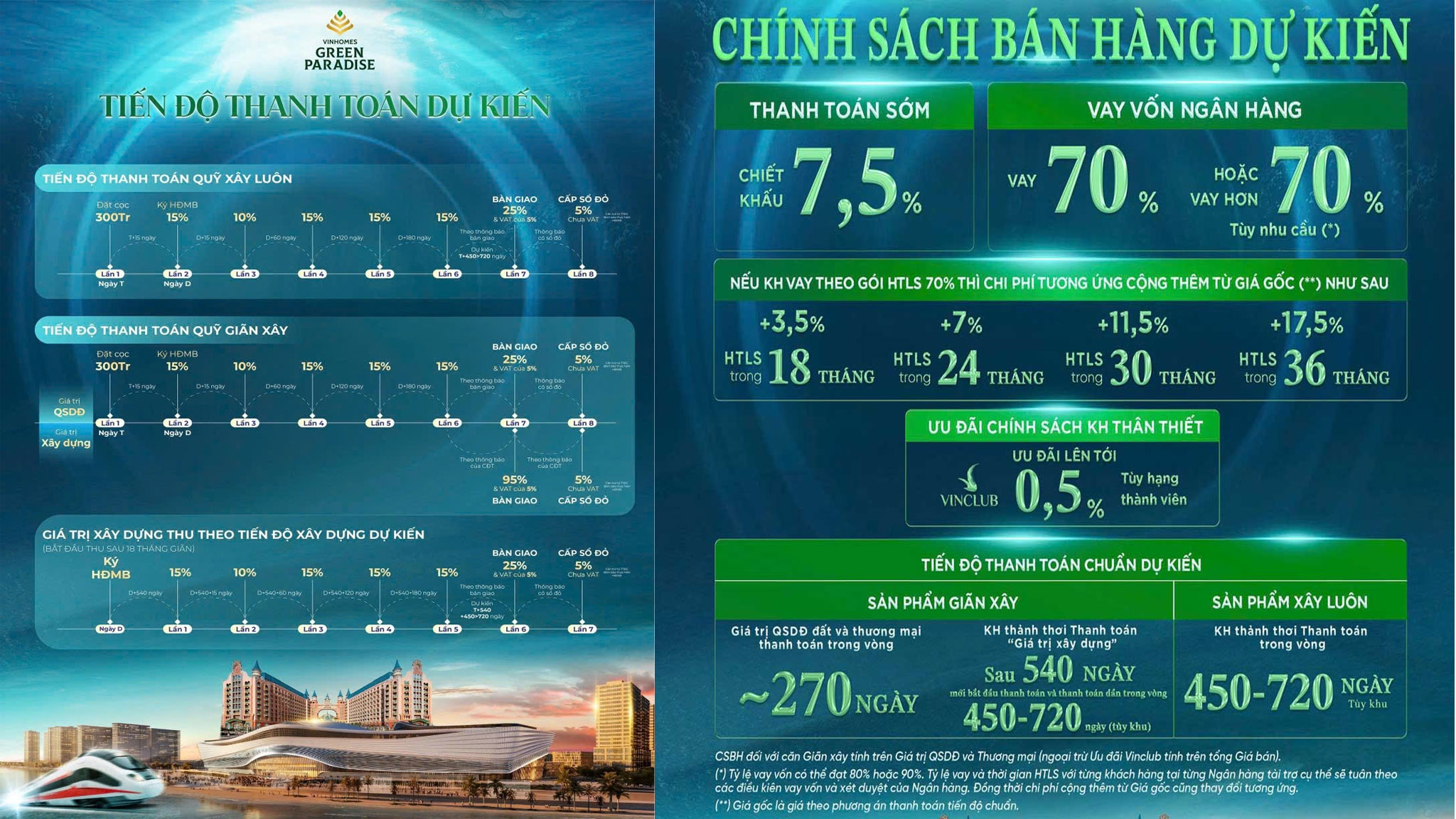 Vinhomes Green Paradise mở ra cơ hội đầu tư mang tính kế thừa dài hạn, nơi hội tụ hài hòa giữa vị trí địa lý hiếm có, tầm nhìn quy hoạch bài bản và hệ thống hạ tầng được phát triển đồng bộ. Không gian sống ven biển tại đây hiện thực hóa khát vọng về một cuộc sống sung túc, nơi mỗi ngày đều gia tăng giá trị cả về tài sản lẫn trải nghiệm sống. Vinhomes Green Paradise là điểm giao thoa giữa ưu đãi thiên nhiên và dấu ấn kiến tạo của con người, từng bước hình thành biểu tượng mới cho sự thịnh vượng bền vững. Đây là cơ hội hiếm hoi để sở hữu “địa chỉ vàng” nơi cửa ngõ hướng biển của TP.HCM – vị trí độc nhất mà thời gian chỉ ban tặng một lần và tương lai sẽ tiếp tục khẳng định giá trị.